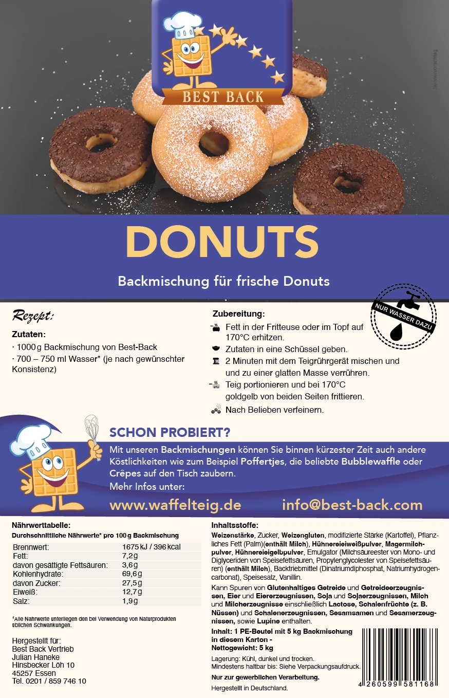 - Teig: Vermengen Sie 1kg unserer Backmischung für Donuts mit ca. 800-900 ml Wasser zu einem glatten Teig, nicht zu flüssigen Teig.